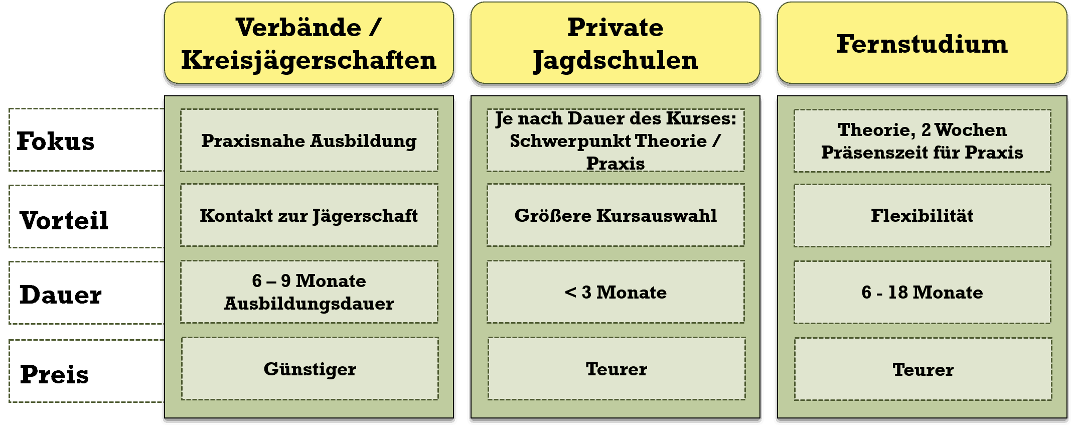 Wenn du dich für eine Kursform, basierend auf deinen zeitlichen Ressourcen und deinen persönlichen Vorlieben, entschieden hast, grenzt das schon einmal die in Frage kommenden Jagdschulen ein.